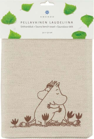 Emendo Muumi Laudeliina – Rakkaus on suloinen ja käytännöllinen lisä saunailtoihin. Pellavan ja puuvillan sekoitteesta valmistettu laadukas tekstiili suojaa lauteita ja tekee istumisesta miellyttävämpää. Vaalealla pohjalla hehkuva kuvitus tuo saunaan lempeän tunnelman: Muumipeikko ja Niiskuneiti halaavat toisiaan kukkien ympäröimänä, mikä luo lämpimän ja romanttisen yksityiskohdan saunomiseen. Laudeliina imee hyvin kosteutta, hylkii likaa ja kestää toistuvaa pesua, joten se on paitsi kaunis myös käytännöllinen. Tämä tekstiili sopii erinomaisesti lahjaksi muumien ystävälle tai kenelle tahansa, joka haluaa tuoda saunaan ripauksen pehmeyttä, nostalgiaa ja rakkautta.
