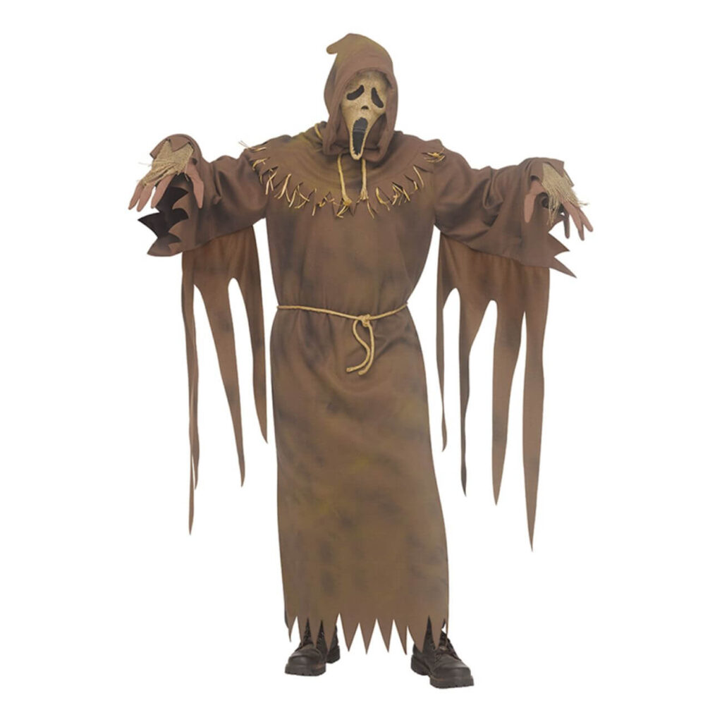 Sumu hiipii maissipellon halki, ja keskellä kenttää seisoo hahmo – Ghost Face linnunpelättimen hahmossa, olkien ja kuluneiden riepujen peitossa. Maa-sävyinen asu rosoisine reunoineen ja hamppunarua muistuttavine yksityiskohtineen luo vaikutelman kirotusta peltojumaluudesta. Säkkikankaasta muotoiltu Ghost Face -naamari huppuineen täydentää karmivan kokonaisuuden: kasvot ovat piilossa, mutta hahmo herättää pelkoa jokaisella liikkeellään. Tämä asu ei jää huomaamatta pimeydessä – se kuiskaa tuskan, pelon ja yön tarinan niille, jotka uskaltavat katsoa.