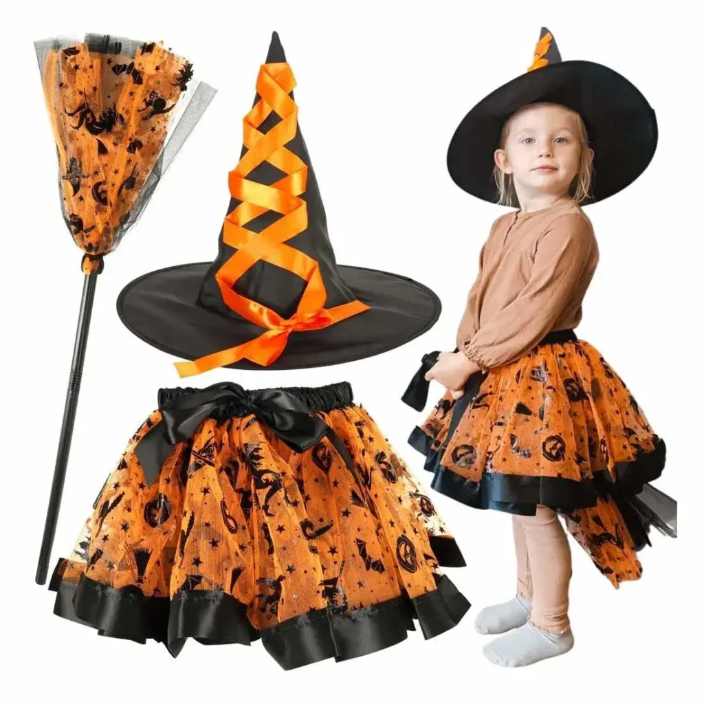 Tanssi yössä, loihdi illan taika! Tämä lumoava Halloween-noitaasu sisältää pöyheän tyllihameen, klassisen noitahatun ja aidon luudanvarren – kaikki oransseilla tehosteilla piristettynä. Valmistettu pehmeästä polyesterista, puuvillasta ja muovista, tämä maaginen kokonaisuus muuntaa sinut juhlan keskipisteeksi!